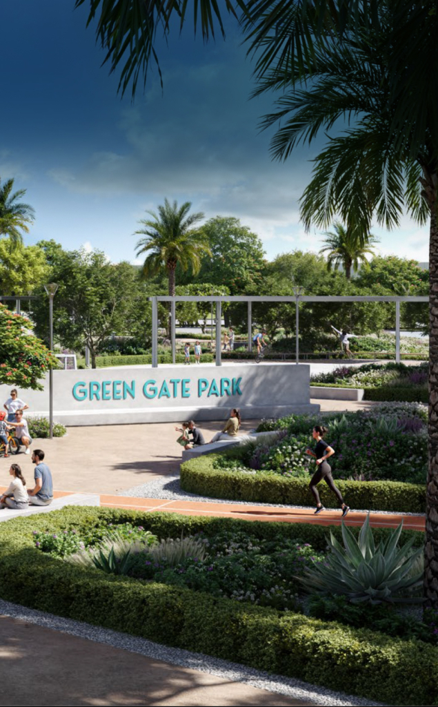 Wohlbefinden und Vitalität: Der Green Gate Park ist eine üppige, landschaftlich gestaltete Oase mit Multisportplätzen, einem Pumptrack und Spielplätzen – ideal für aktives Spielen und ruhige Entspannung.